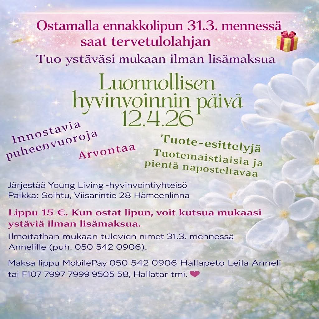 31.3.26 mennessä lipun ostaneet saavat ottaa kavereita mukaan samalla hinnalla. Kaverien nimet ilmoittamalla Annelille 050 542 0906 samaan päivään mennessä saatte jokainen tervetulolahjan ✨